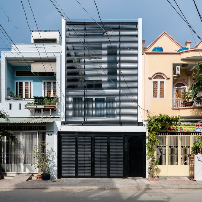 Nơi đây, mật độ giao thông đúc. Để ngăn chặn bụi và nắng cho ngôi nhà, các kiến trúc sư Đoàn Sĩ Nguyên, Lê Đình Mạnh, Trần Văn Nam, Nguyễn Hiền Triển (Sawadeesign) đã thiết kế một hệ lam ngang cho mặt đứng.